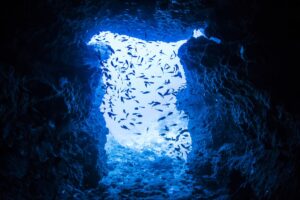 青の洞窟は初心者や体験ダイビングでも有名なポイントです。青の洞窟は出入り口が青く輝いています、透明度が良い水・水深・白い水底この3つが揃ってないと青の洞窟はできません。